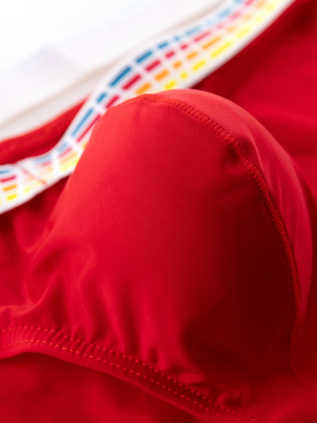 This men's underwear has a sleek and minimalistic design with a vibrant waistband featuring a colorful. geometric pattern. The fit is snug and supportive. emphasizing comfort and a streamlined look. The material appears to be smooth and stretchy. likely offering a comfortable fit for daily wear or athletic activities. The rear view shows a full coverage design. ensuring both style and practicality.
