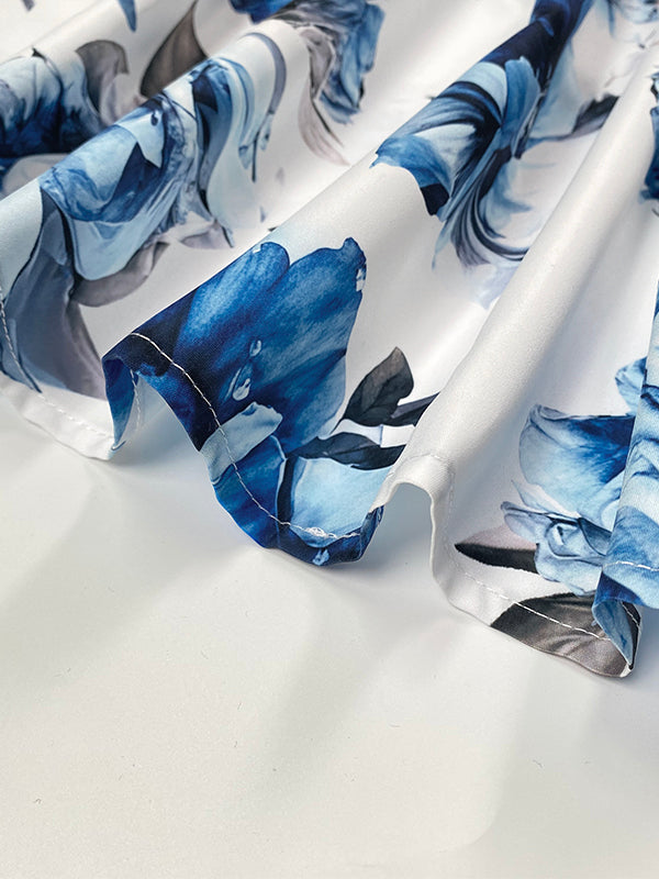 A-Line High Waisted Contrast Color Flower Print Pleated Halter-Neck Maxi Dresses