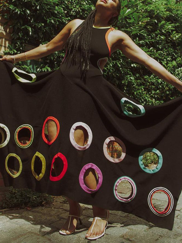 A-Line High Waisted Contrast Color Hollow Round-Neck Maxi Dresses