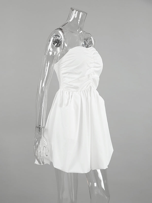 A-Line High Waisted Elasticity Pleated Pockets Solid Color Tube Mini Dresses