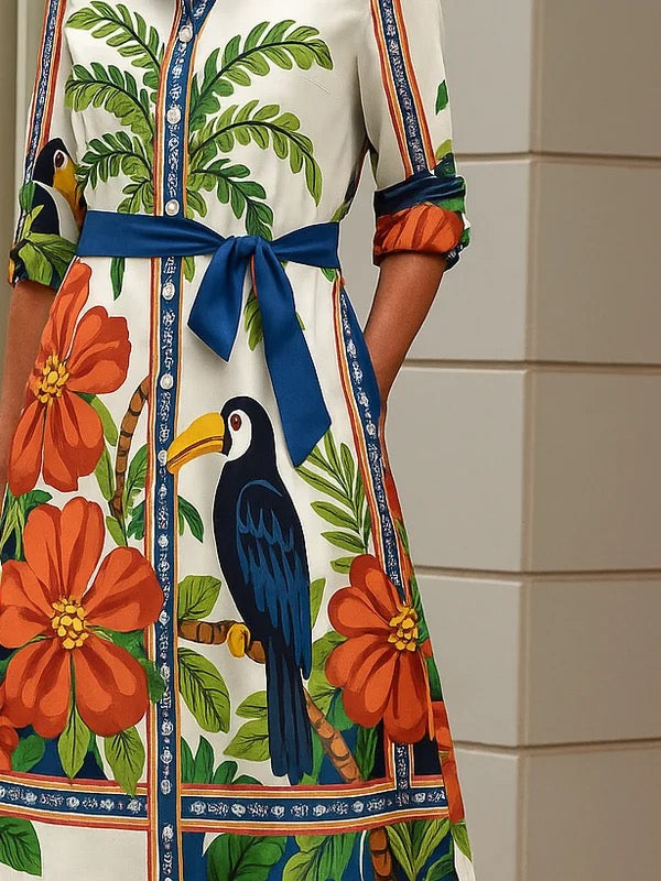 A-Line Long Sleeves Buttoned Contrast Color Flower Print Pockets Tied Waist Lapel Midi Dresses