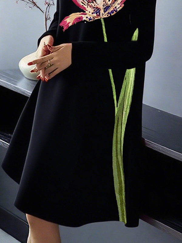 A-Line Long Sleeves Flower Print Pockets Mock Neck Midi Dresses