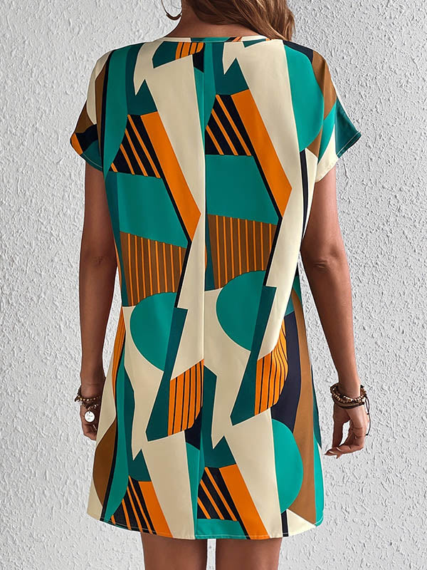 A-Line Loose Contrast Color Printed Zipper V-Neck Mini Dresses