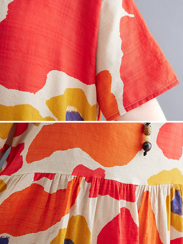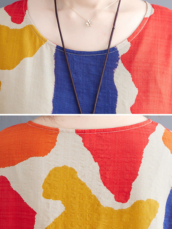 Artistic Retro Short Sleeves Loose Contrast Color Printed Round-Neck Midi Dresses