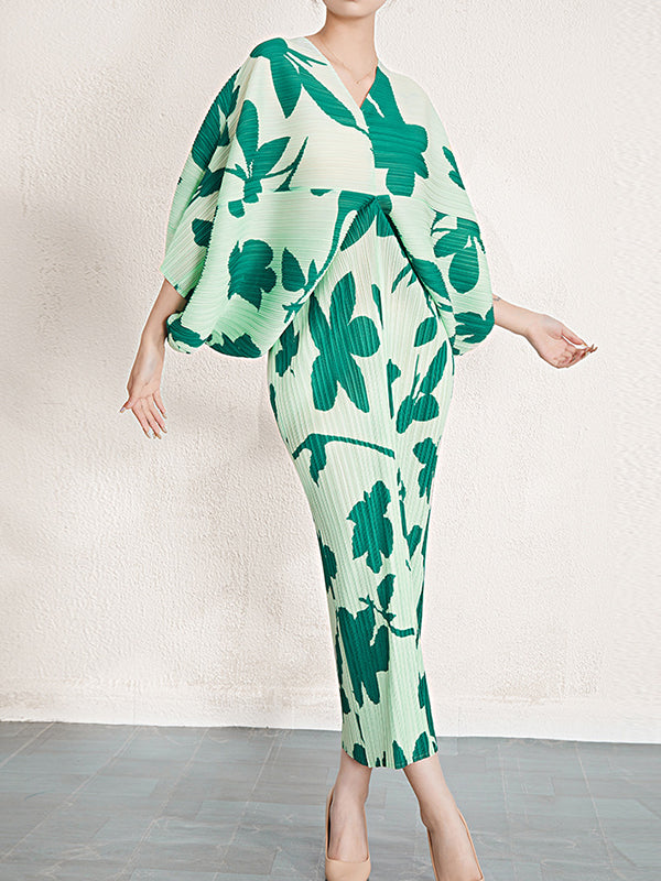 Batwing Sleeves Loose Pleated Printed V-Neck Midi Dresses