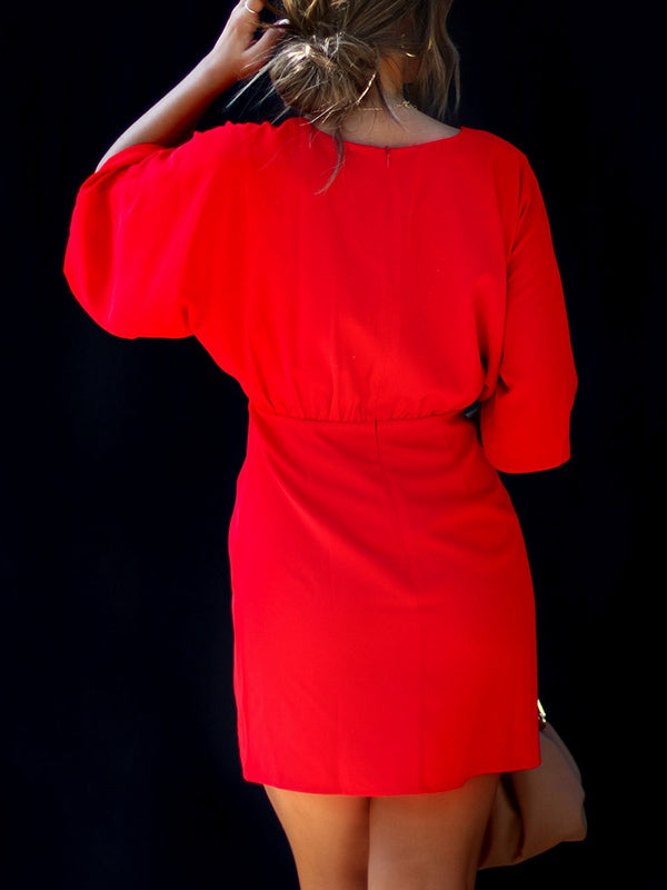 Batwing Sleeves Skinny Pleated Solid Color Split-Joint V-Neck Mini Dresses