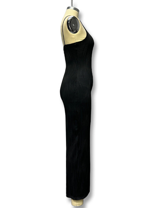 Bodycon Sleeveless Pleated Solid Color Split-Back Split-Joint Zipper Spaghetti-Neck Maxi Dresses