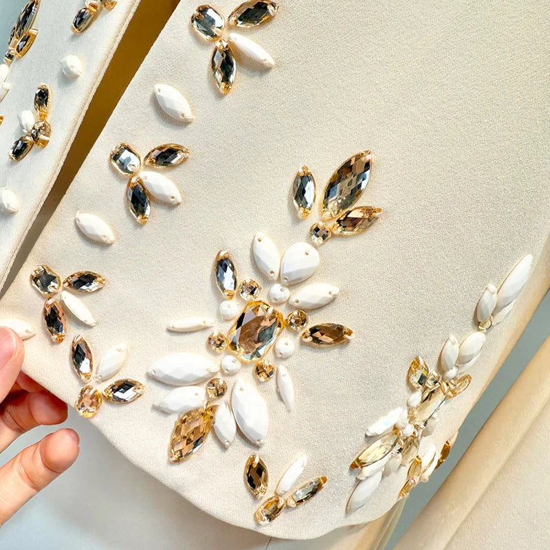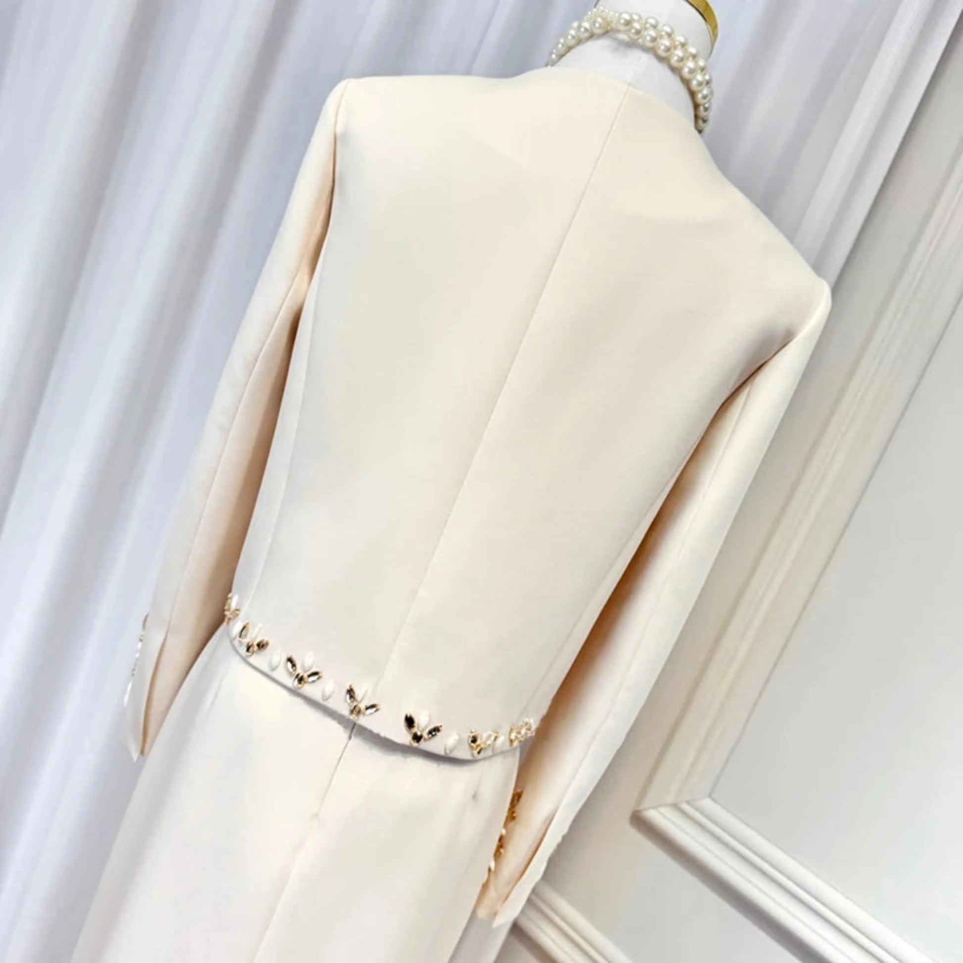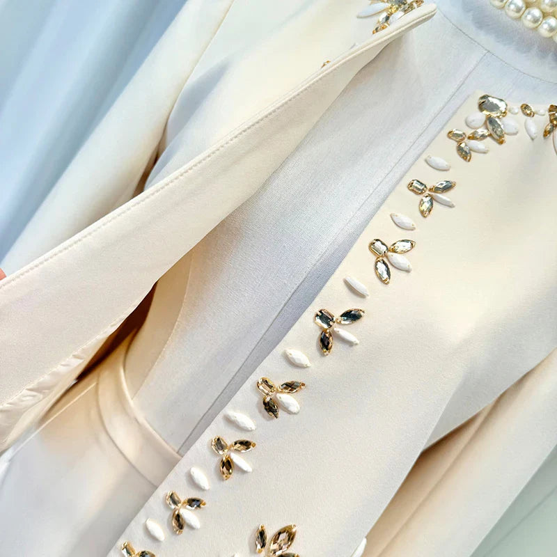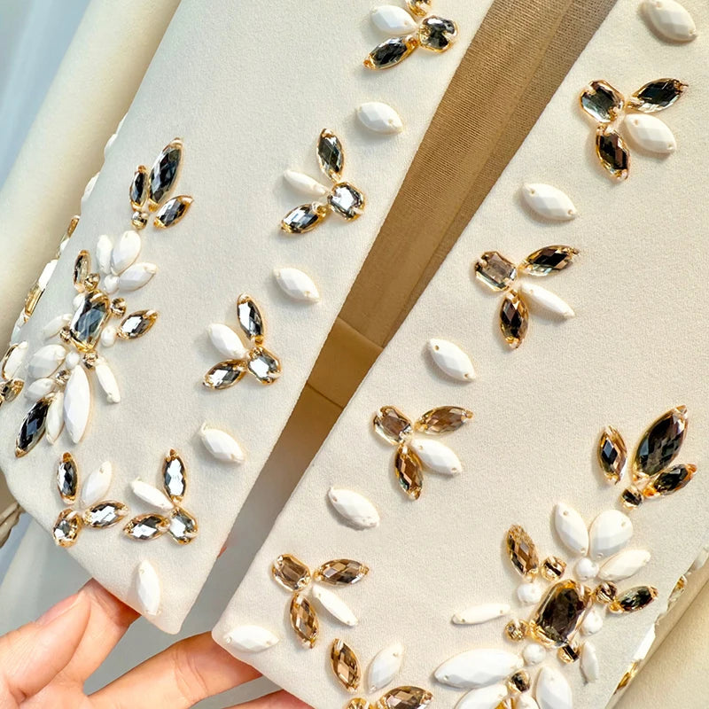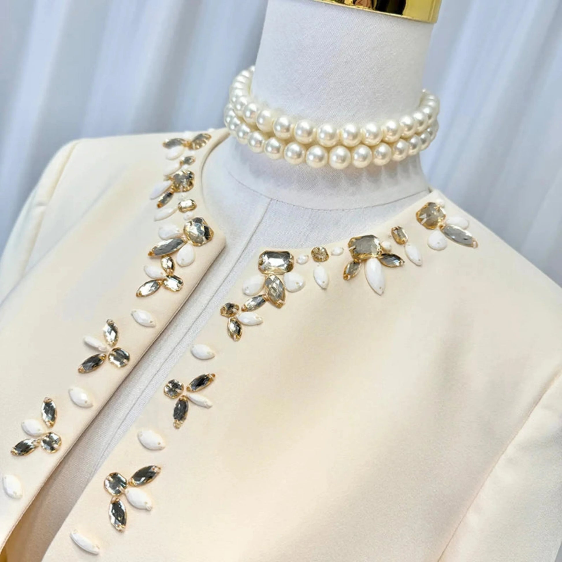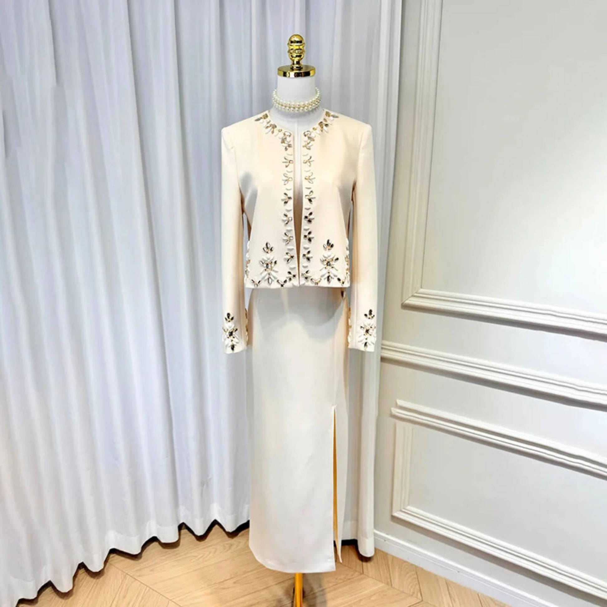 Need something elevated yet unforgettable for an upscale event? This two-piece suit set with crystal detailing was made for grand entrances and all eyes on you. Featuring a blazer and flowing maxi skirt. it blends elegance. sparkle. and confidence in one stunning look.