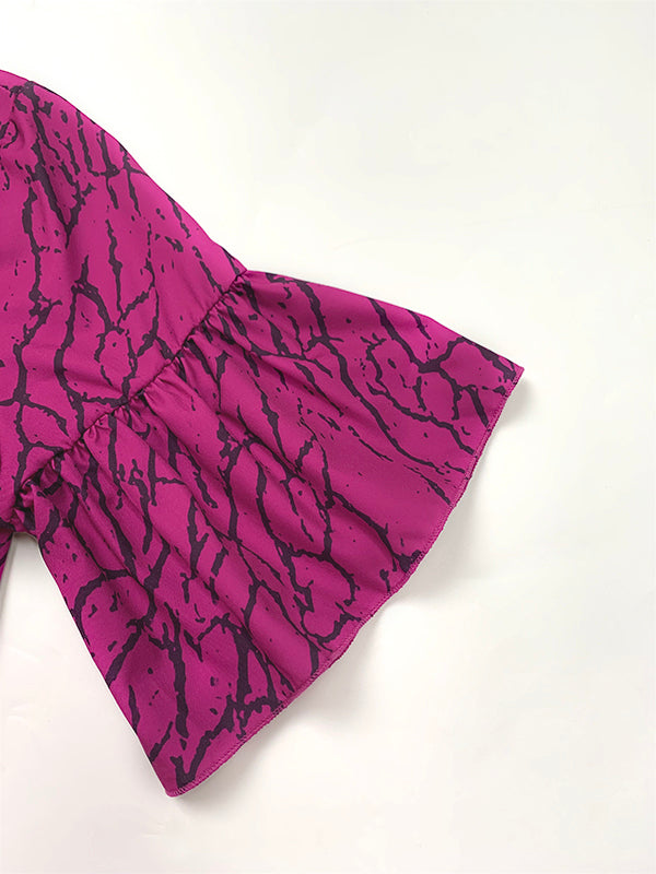 Flared Sleeves Half Sleeves Asymmetric Layered Pleated Printed Ruffle Trim Round-Neck Maxi Dresses