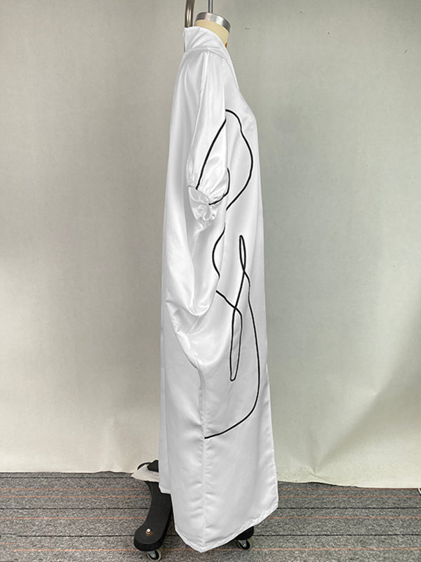 Half Sleeves Loose Elasticity Printed Split-Front Stand Collar Maxi Dresses