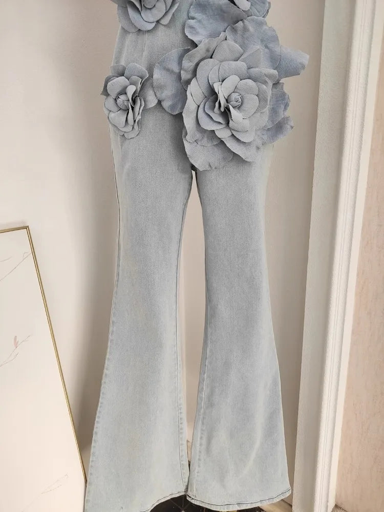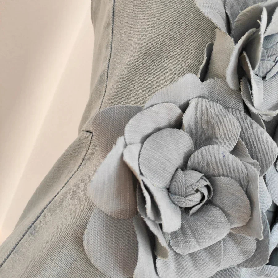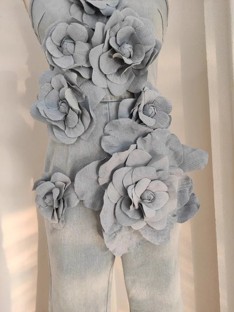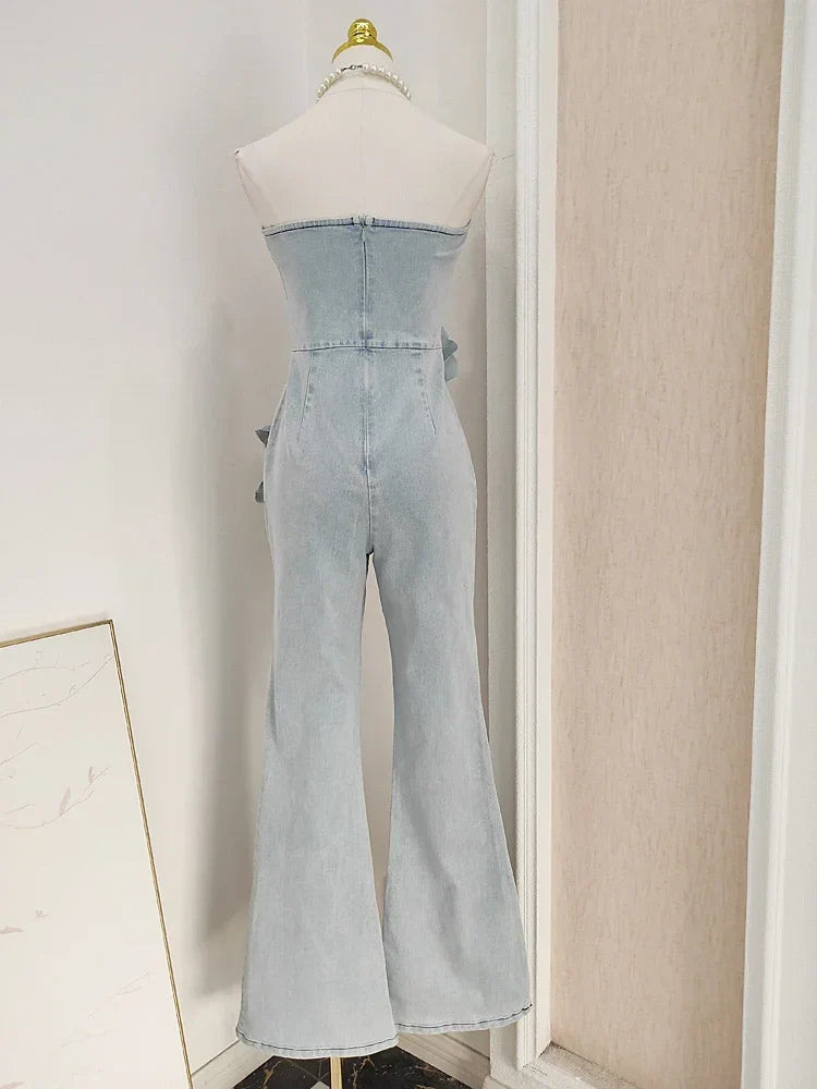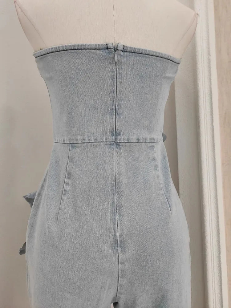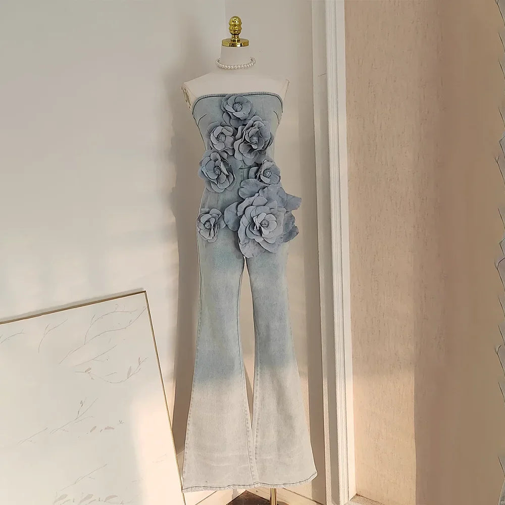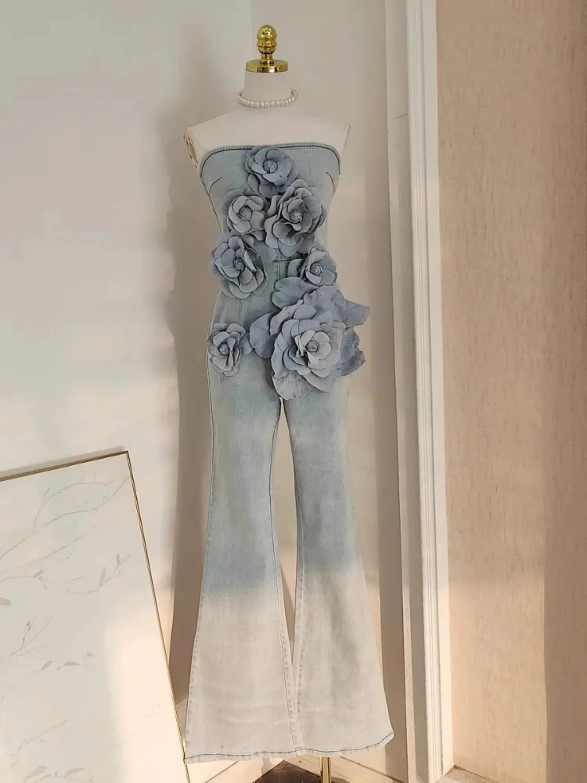 Searching for something edgy. feminine. and unforgettable for nights out or chic events? This strapless denim jumpsuit brings together high-end structure with delicate floral detailing for a look that stuns from dinner to rooftop.