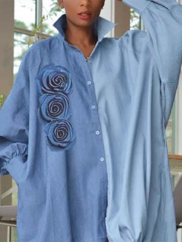 Long Sleeves Loose Buttoned Three-Dimensional Flower Lapel Midi Dresses Shirt Dress