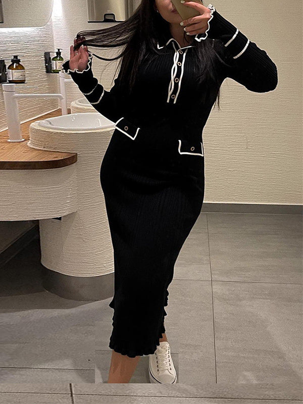 Long Sleeves Pleated Ruffled Split-Joint Lapel Maxi Dresses Sweater Dresses