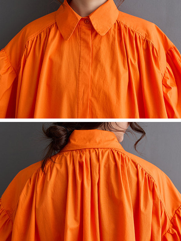 Loose Puff Sleeves Contrast Color Pleated Split-Joint Lapel Midi Dresses Shirt Dress