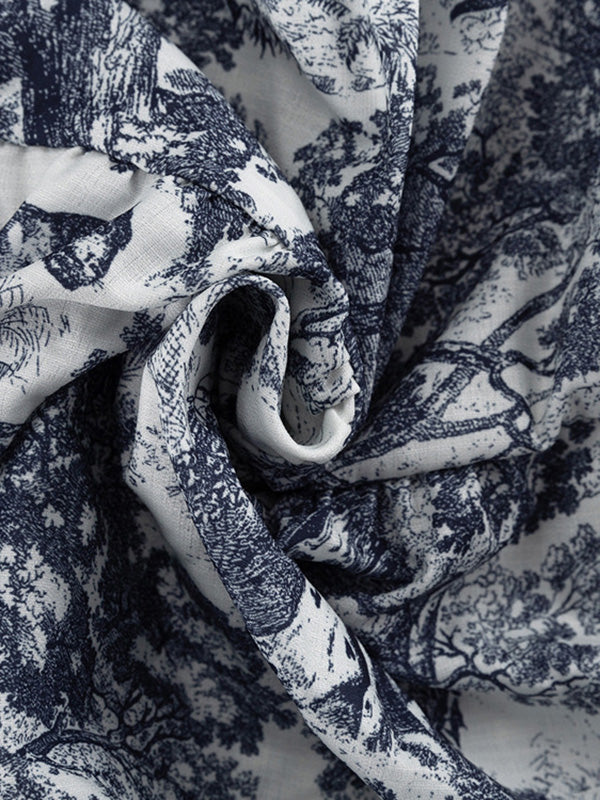 Loose Puff Sleeves Pleated Printed Split-Joint Tied Waist Lapel Mini Dresses Shirt Dress