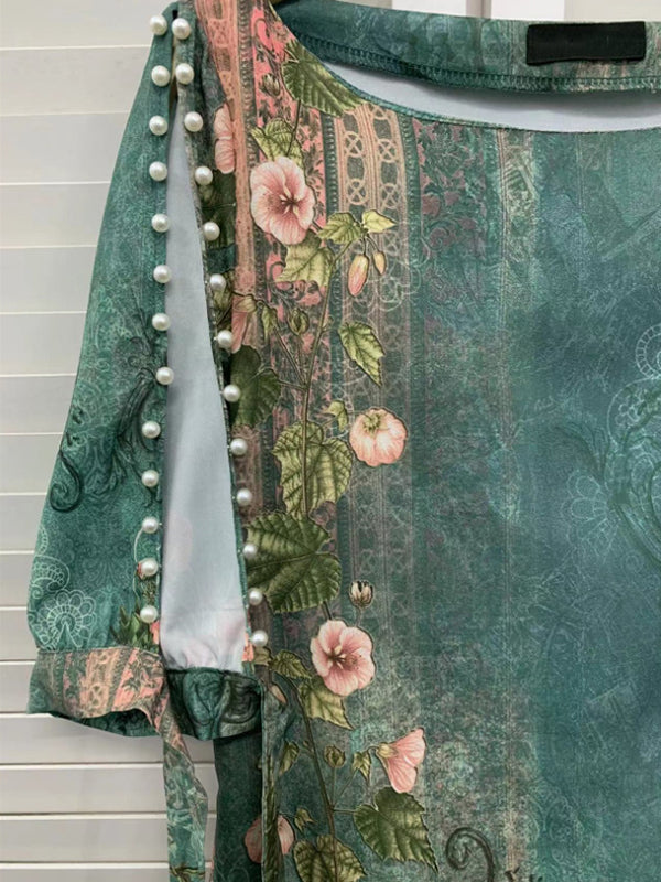 Loose Short Sleeves Hollow Printed Split-Joint Round-Neck Mini Dresses