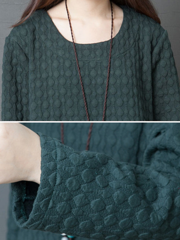 Loose Solid Color Split-Joint With Pocket Round-Neck Long Sleeves Midi Dress