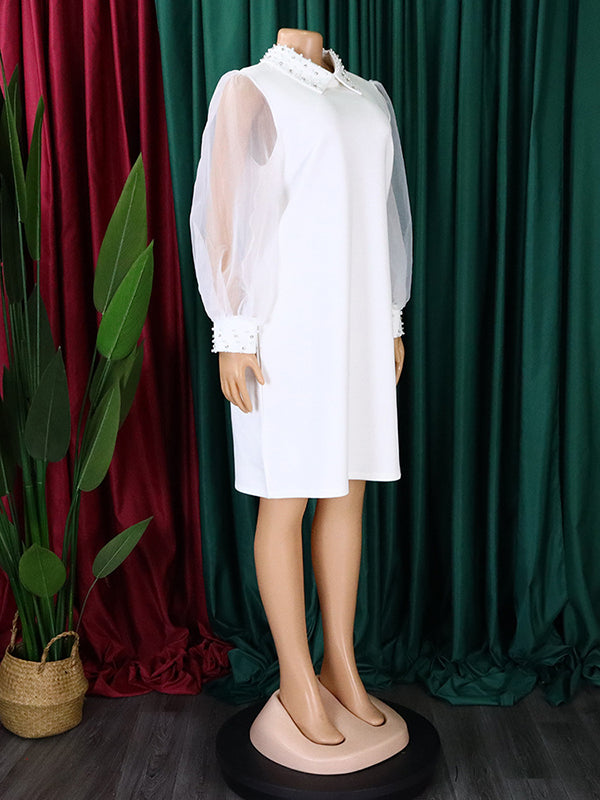 Puff Sleeves Beads Mesh Solid Color Split-Joint Round-neck Midi Dresses