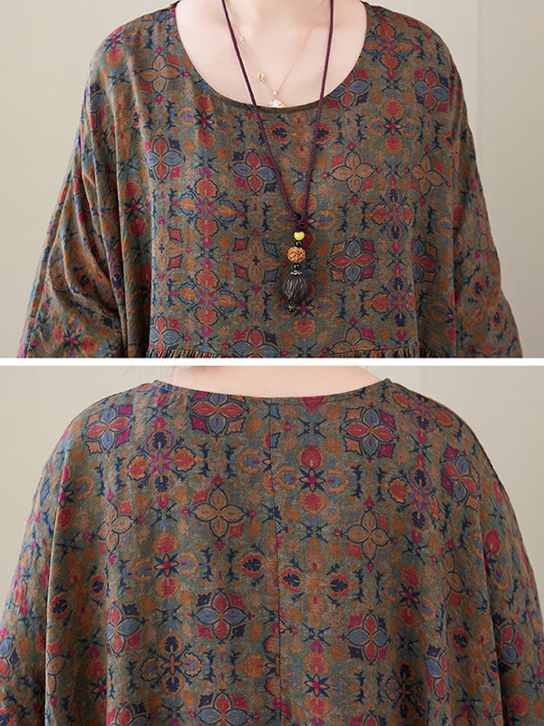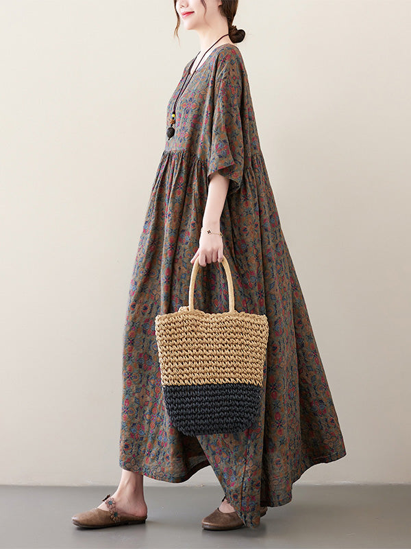 Vacation Loose Half Sleeves Floral Printed Pleated Round-Neck Midi Dresses